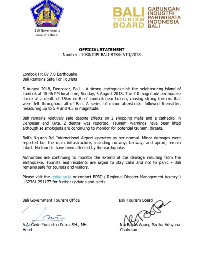 OFFICIAL STATEMENT FROM BALI GOVERNMENT TOURISM OFFICE AND BALI TOURISM BOARD